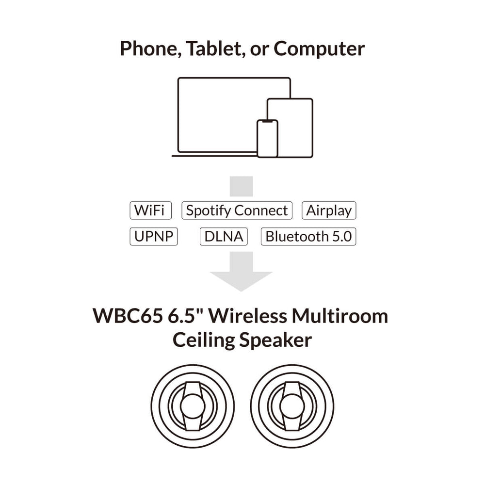 6.5-inch wireless multiroom ceiling speaker pair with integrated amplification and streaming, delivering powerful stereo sound, flexible mono operation, and seamless multiroom audio control with clean, cable-free in-ceiling installation.