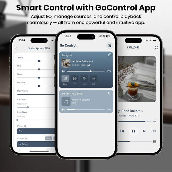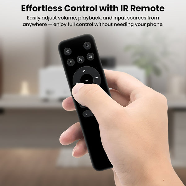 The LP20 offers intuitive and flexible control options. Users can manage playback through a dedicated control application, the included infrared remote, or the front-panel rotary knob for quick volume and navigation adjustments. This combination allows comfortable operation whether using a smartphone, sitting across the room, or interacting directly with the device.