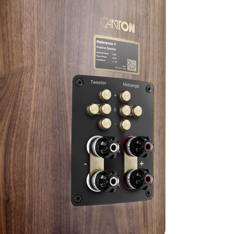 The Canton Reference 5 Walnut Matt is a high-end 3-way floorstanding speaker with BCT drivers, optimized cabinets, and Wave Beading technology, delivering dynamic, precise sound with rich bass and detailed highs and mids.