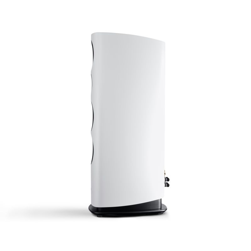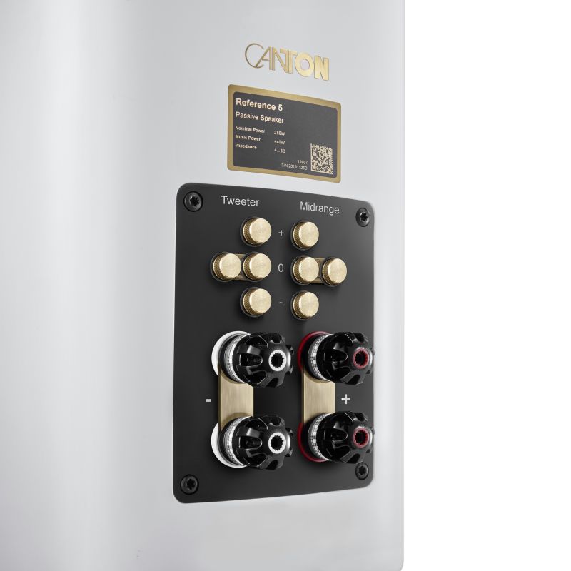 High-quality WBT Nextgen terminals support single, bi-wiring, and bi-amping connections, and gold-plated copper bridges are included for standard operation. Integrated Room Compensation (RC) allows precise level adjustments of the midrange and tweeter in 1.5 dB steps to suit room acoustics and listening preferences. The multi-layer laminate cabinet is finished in White Matt, offering a refined, modern appearance while maintaining acoustic neutrality.