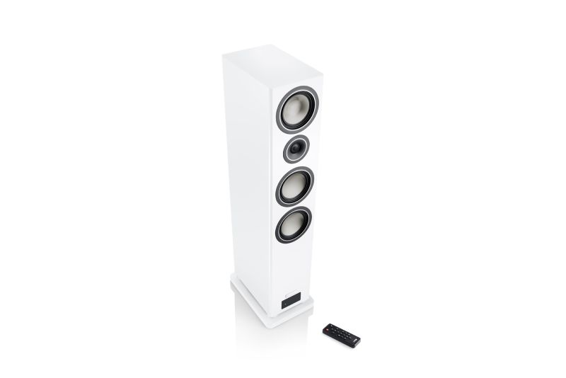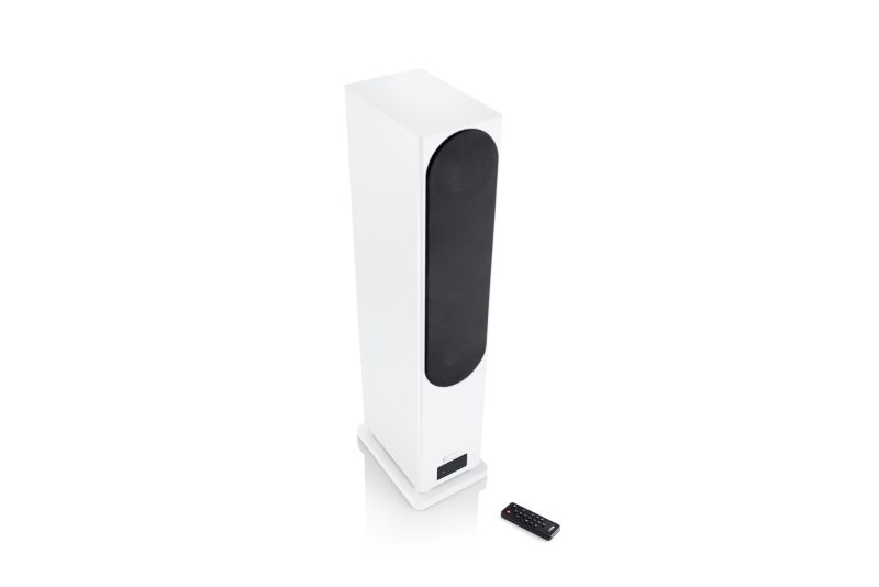 Premium wireless floorstanding loudspeaker in White Matt finish delivering powerful three-way bass-reflex sound, titanium driver technology, Dolby Audio support, extensive connectivity, and flexible configuration for stereo, multiroom, and home cinema use.