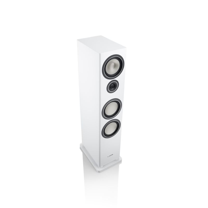 Elegant 3-way floorstanding speaker delivering dynamic bass, detailed mids, and extended highs, featuring refined White Matt cabinetry, advanced driver technology, and balanced sound dispersion for stereo and home cinema systems.