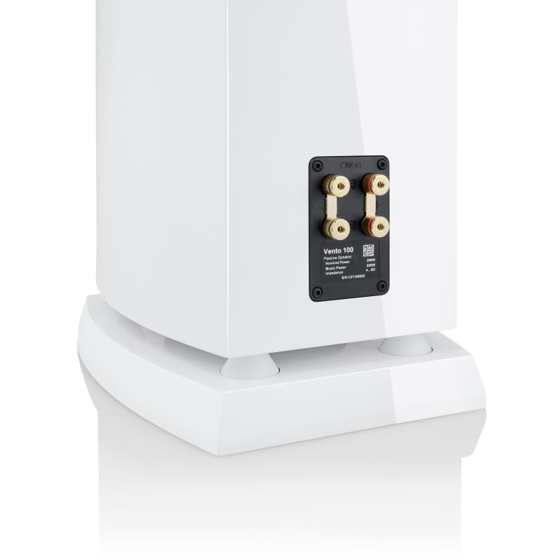 Gold-plated bi-wiring terminals ensure secure and flexible system integration. Additional technologies such as wave surrounds, double cone construction, and room adjustment features further enhance sound quality and adaptability, making the Vento 100 a versatile high-end loudspeaker for demanding listening environments.