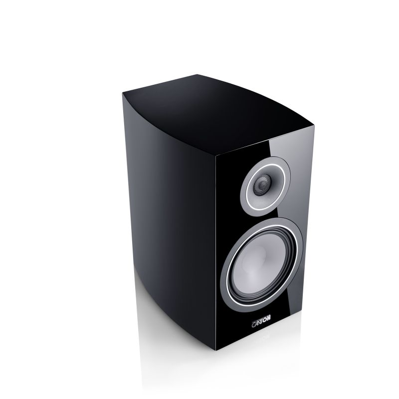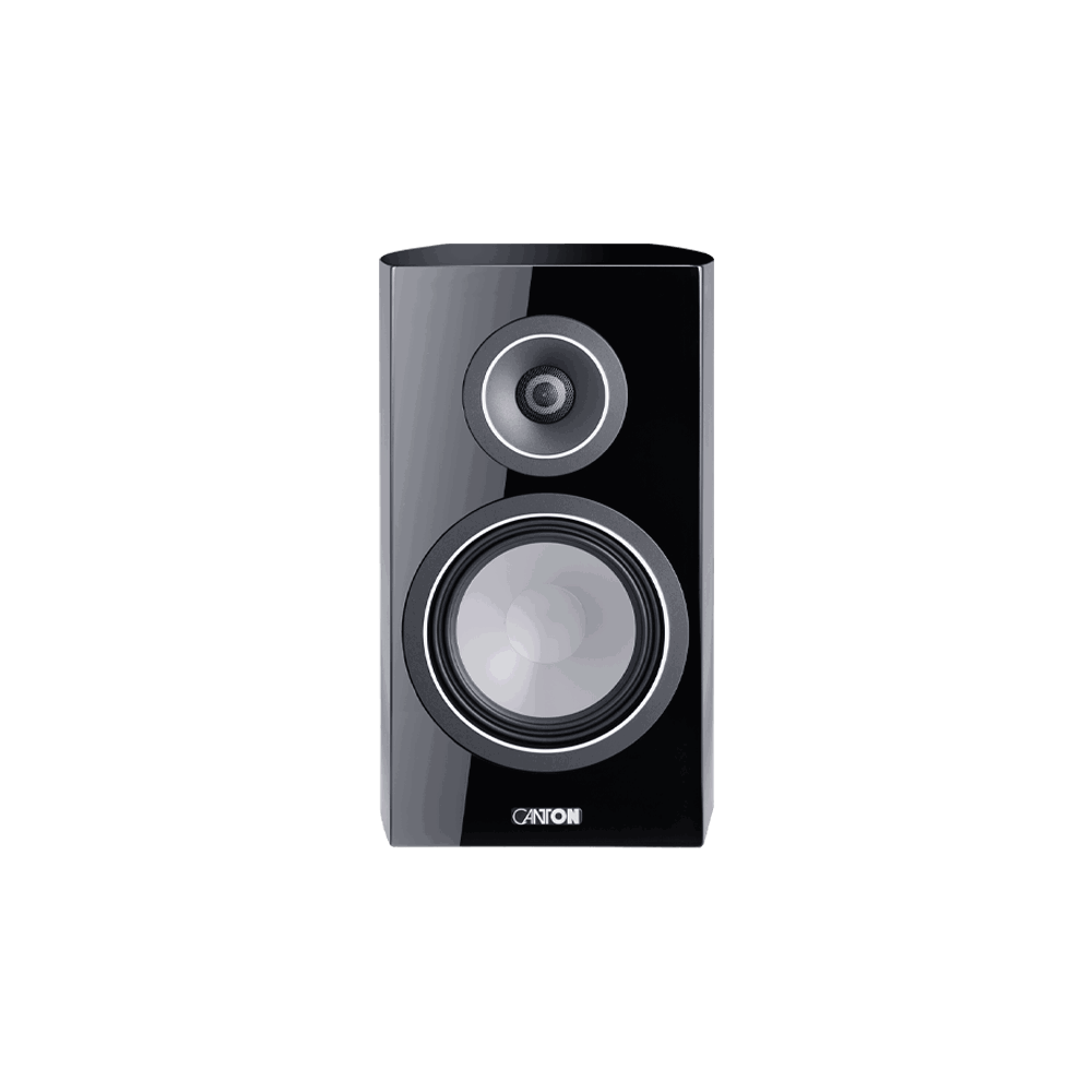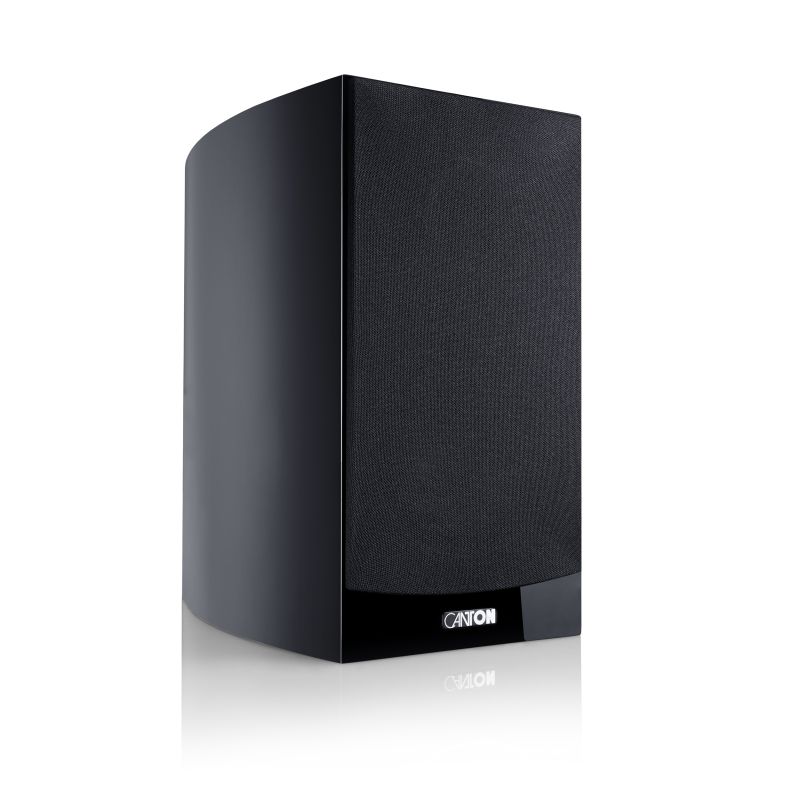 Compact two-way bass reflex loudspeaker delivering iconic Canton sound, titanium-graphite driver technology, refined cabinet design, balanced tonality, and dynamic performance for stereo and home cinema applications in modern living spaces.