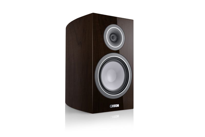 Compact two-way bass reflex loudspeaker in walnut dark high-gloss delivering iconic Canton sound titanium-graphite drivers balanced tonality refined cabinetry and dynamic performance for stereo and home cinema systems listening environments.