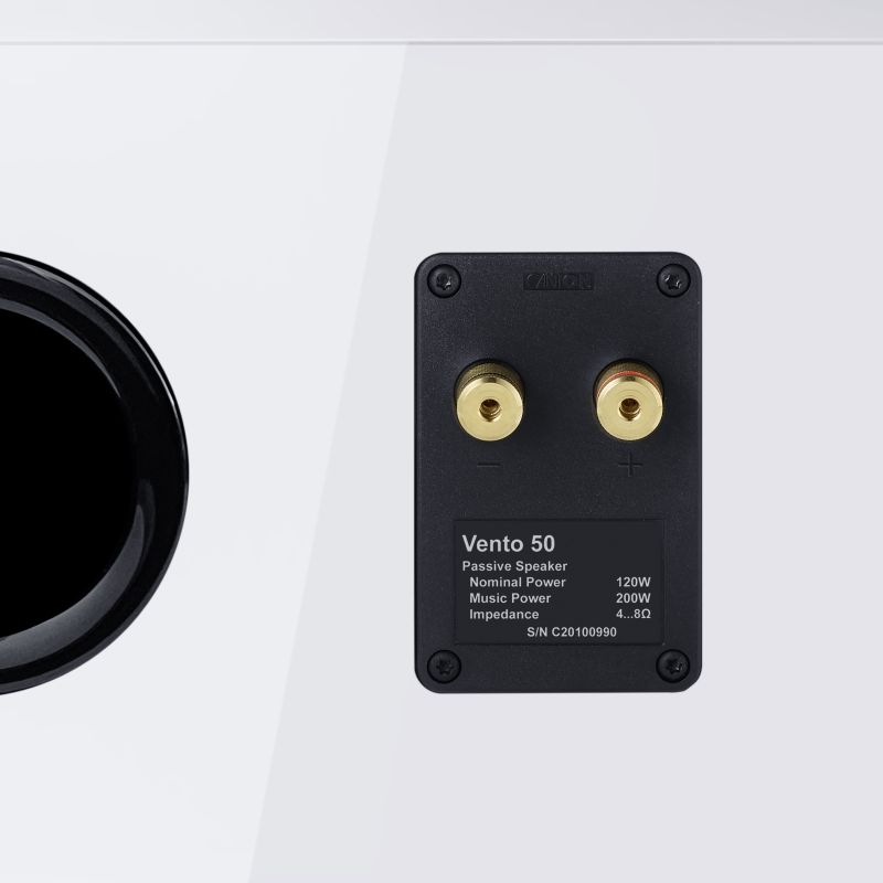 The cabinet is designed to optimize acoustic performance, featuring multi-layer laminate construction, internal bracing, and sufficient internal volume for extended low-frequency response. Refined cabinet radii and a rear bass-reflex port reduce interference, providing clean, contoured sound. Gold-plated screw terminals allow secure, high-conductivity connections, and the magnetically attached, acoustically neutral fabric grille maintains the elegant white high-gloss finish. The Vento 50 White High-Gloss is a premium centre channel speaker, offering high-quality craftsmanship, stylish design, and dynamic home cinema performance.