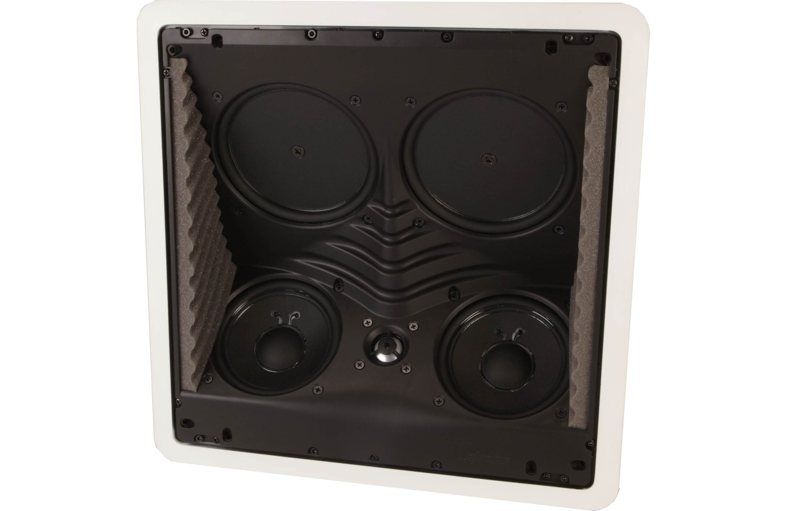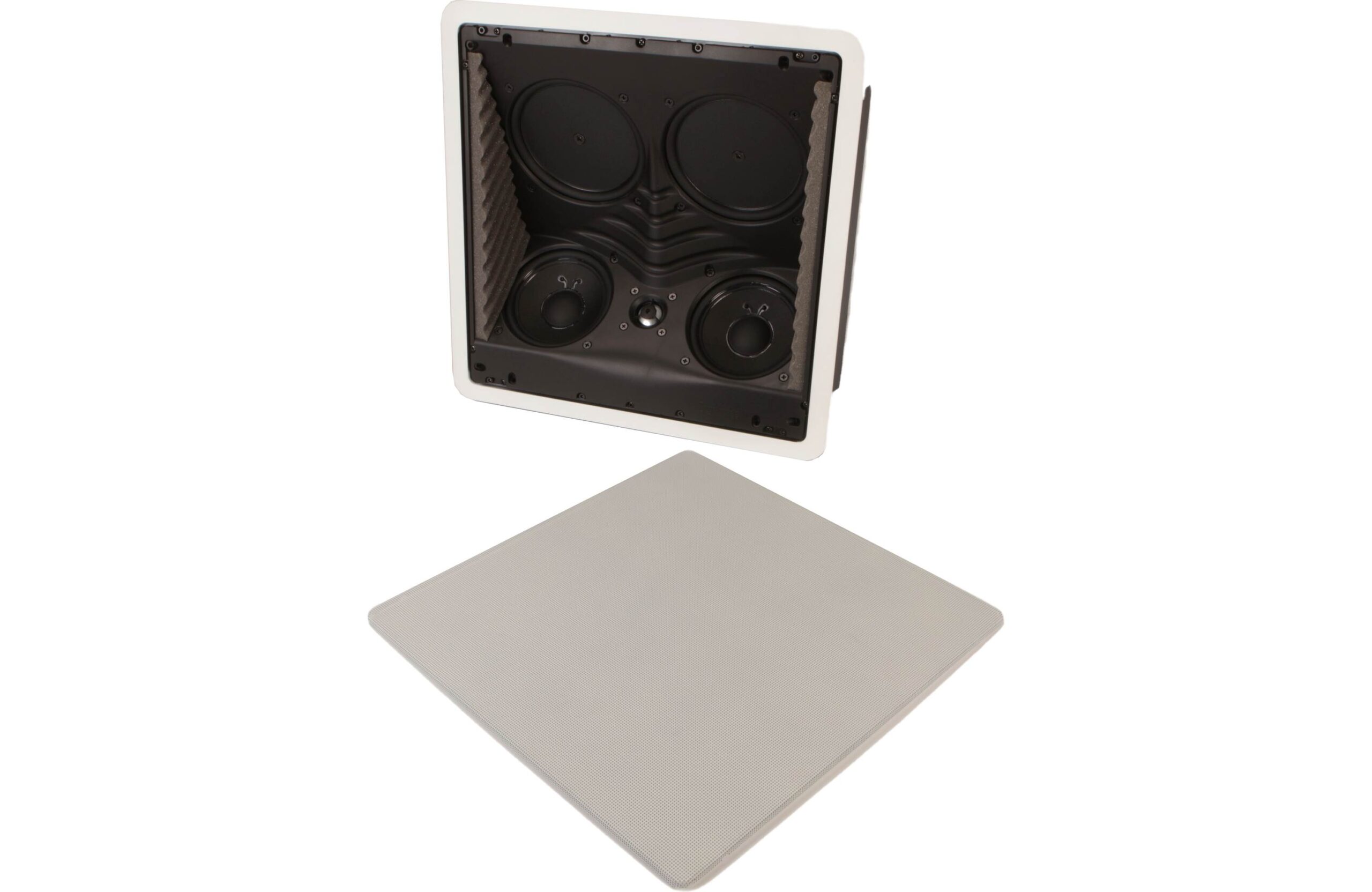 High-performance in-ceiling speaker with dual midrange/bass drivers, pressure-coupled passive radiators, and aluminum dome tweeter, offering clear, balanced sound and easy integration into home theater or music systems.