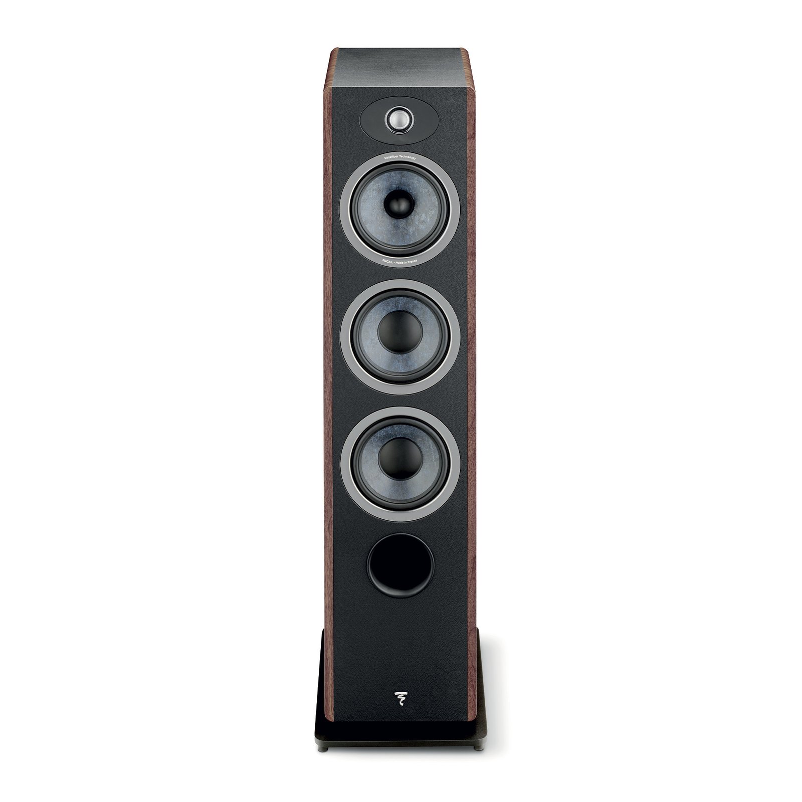 The Focal Vestia N°2 floorstanding loudspeaker in Dark Wood finish delivers high-definition Hi-Fi performance with Slatefiber drivers, TAM tweeter technology, and a bass-reflex design for immersive stereo or home theater listening.