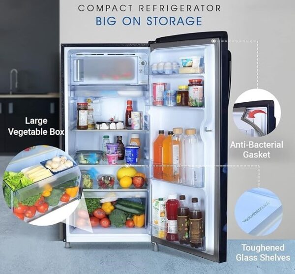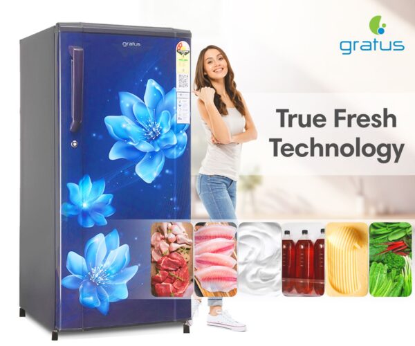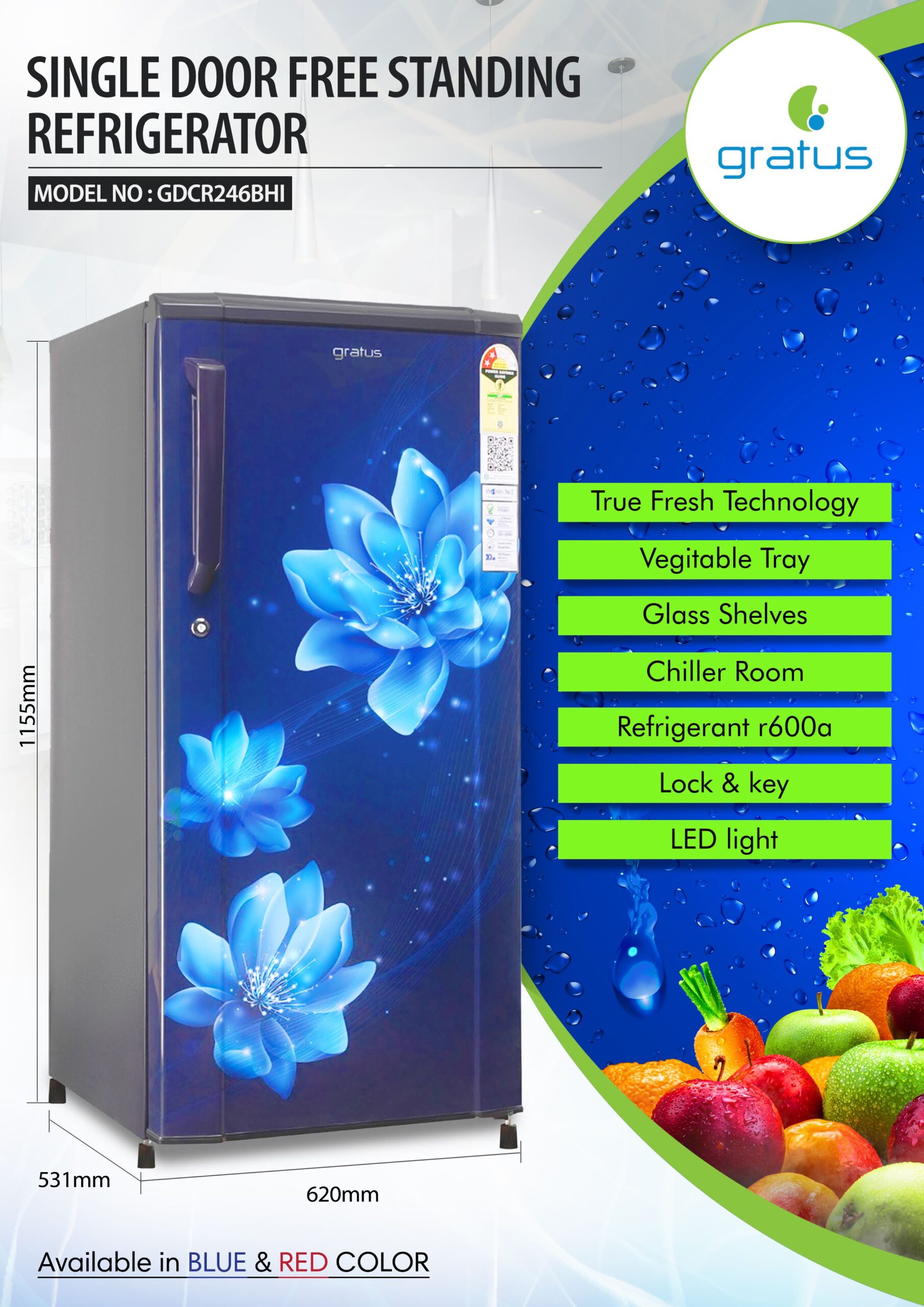 Gratus GDCR246BHI is a 246L single-door refrigerator designed with diamond-edge cooling, toughened glass shelves, antibacterial gasket, large vegetable box, humidity control, and 1-hour quick ice-making – ideal for small households seeking energy-efficient, hygienic, and stylish cooling.