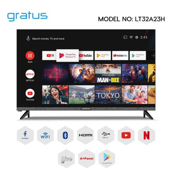 GRATUS LT32A23H 32″ Edgeless HD ready LED Smart TV, DVB T2/S2 Built-in receiver, Android 12, 2 USB, 3 HDMI, High Resolution,