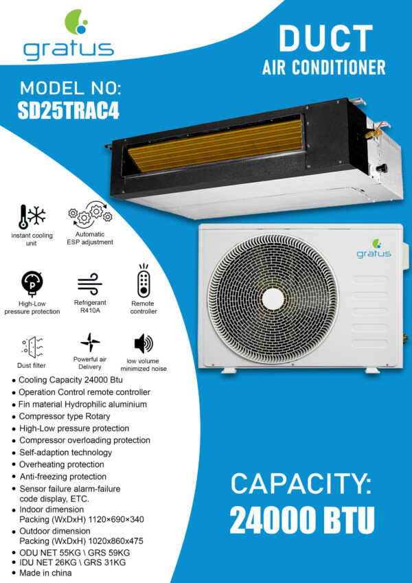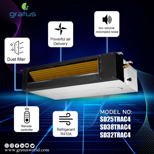Gratus SD32TRAC4 is a robust 2.5-ton duct-type air conditioner engineered for superior cooling even in harsh climates. Equipped with advanced protection systems, automatic self-adaptive airflow, and corrosion-resistant design, it ensures efficient, quiet, and long-lasting performance under all operating conditions.