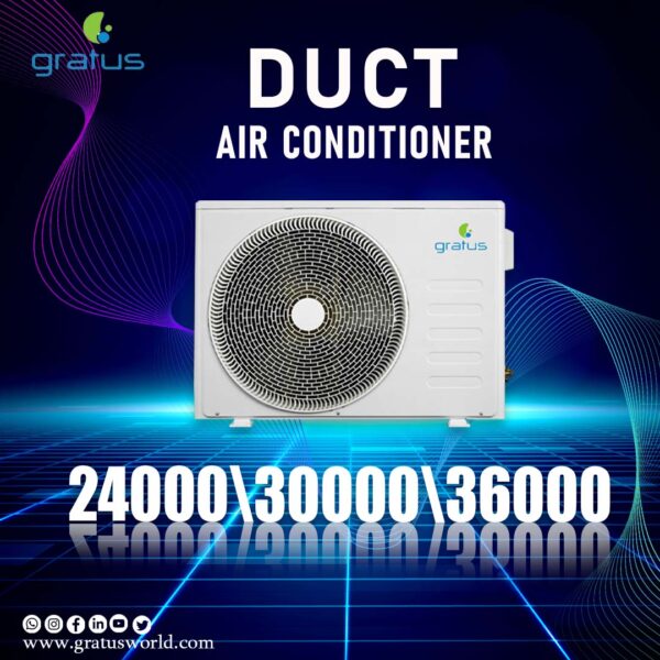 Built for durability and performance, the Gratus 2.5 Ton Duct Type Air Conditioner (Model: SD32TRAC4) is designed to withstand extreme environments, operating efficiently at ambient temperatures up to 55°C. It offers multiple safety protections such as high/low pressure, overheating, phase error, anti-freezing, and compressor overload protection to keep the unit running reliably within safe parameters. Featuring self-adaptation technology for automatic ESP adjustments, this AC optimizes airflow and reduces noise levels for enhanced comfort. The unit also includes a flexible air intake system with rear and optional bottom intake options for versatile installation. Its galvanized metal housing with advanced powder coating technology offers exceptional resistance against corrosion, making it ideal for coastal or humid environments.
