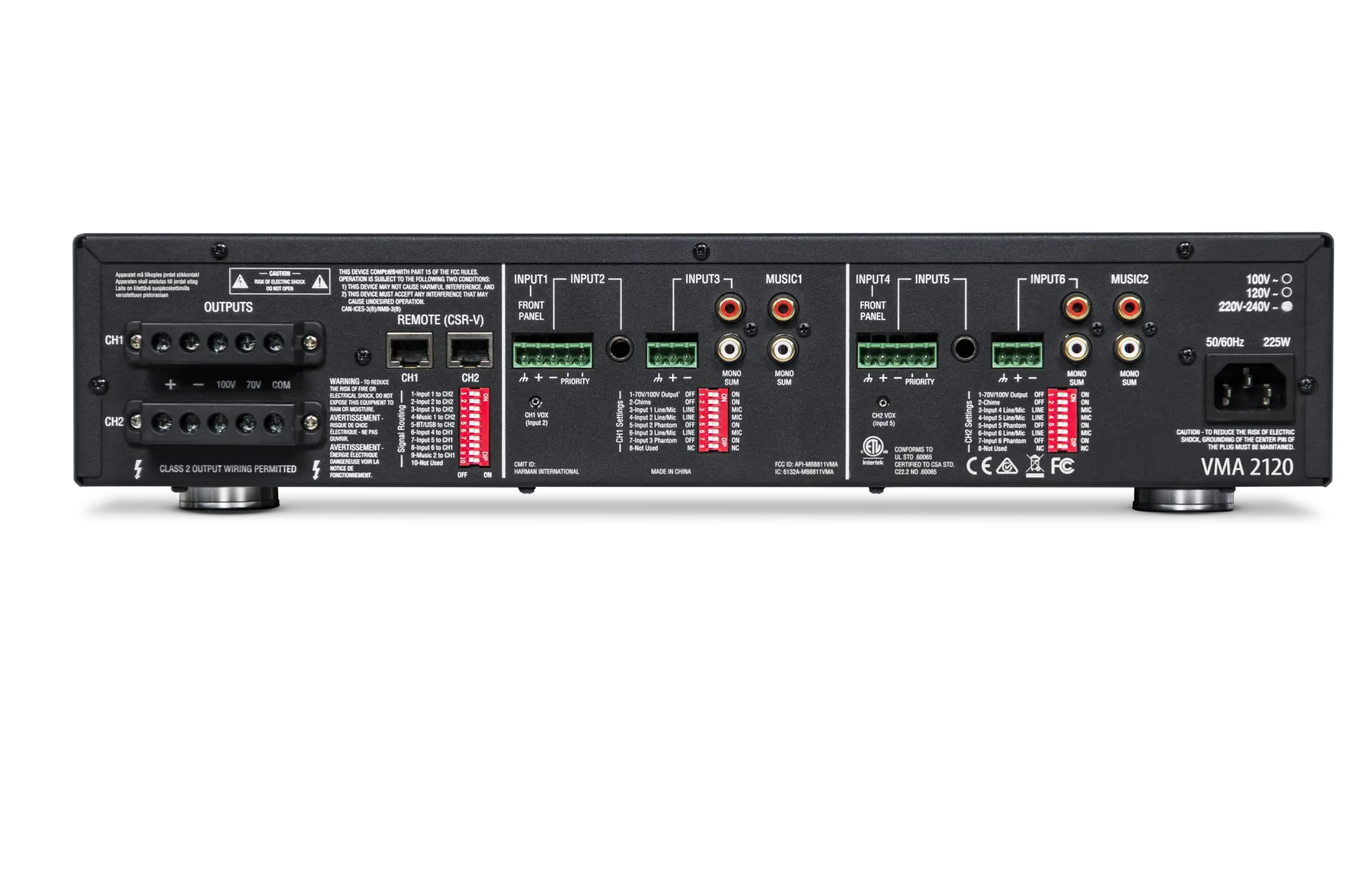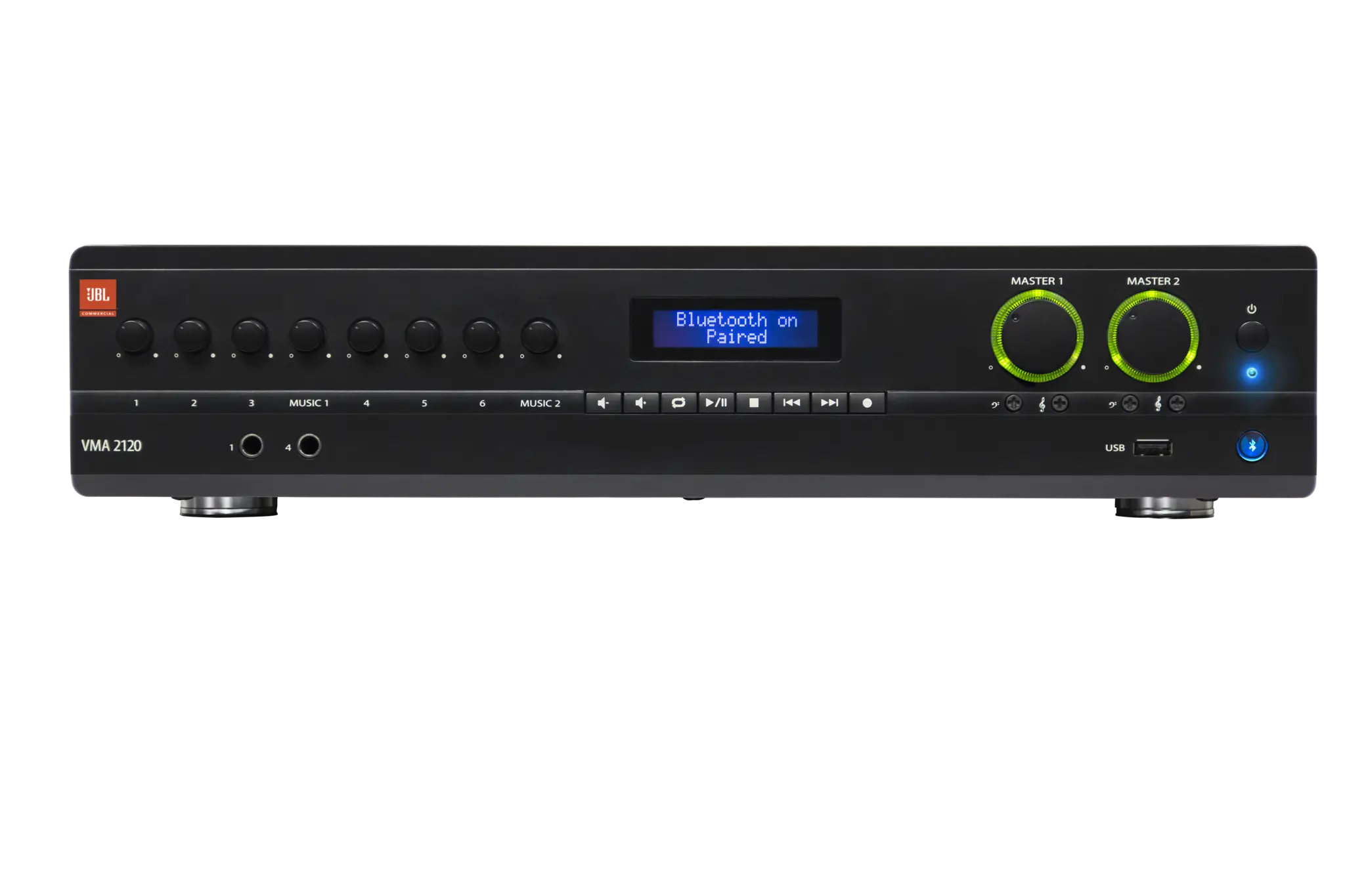The JBL NVMA2120-34-UK Mixer-Amplifier delivers professional 120W commercial audio with low and high-impedance outputs, independent tone controls, multiple inputs and outputs, and a compact 1U fanless rack-mount design.
