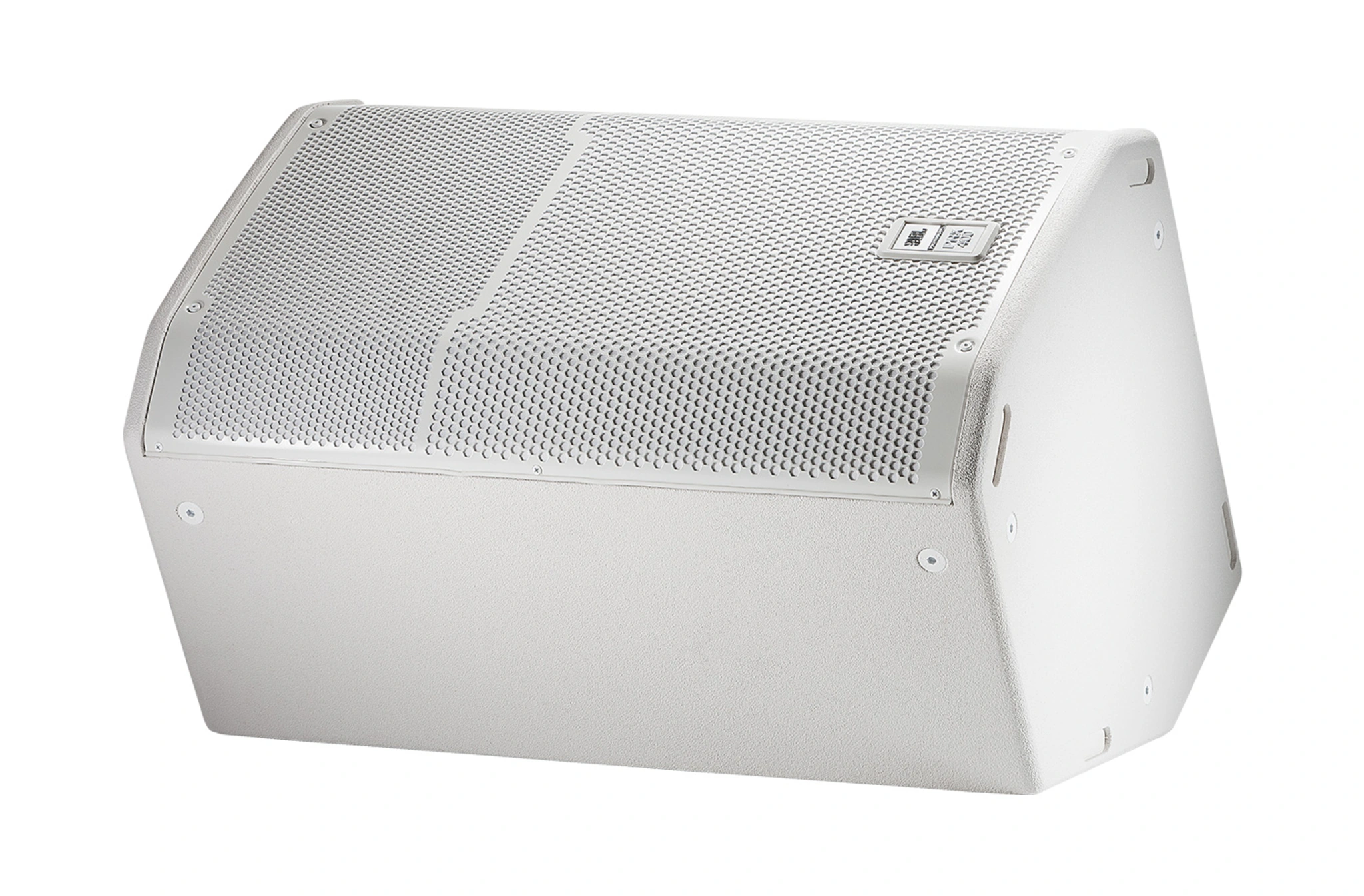 JBL PRX415M-WH 15-inch two-way white stage monitor delivers 122 dB continuous SPL with 90° x 50° coverage, durable DuraFlex enclosure, heavy-duty cloth-backed grille, and versatile deployment for live sound and monitoring applications.