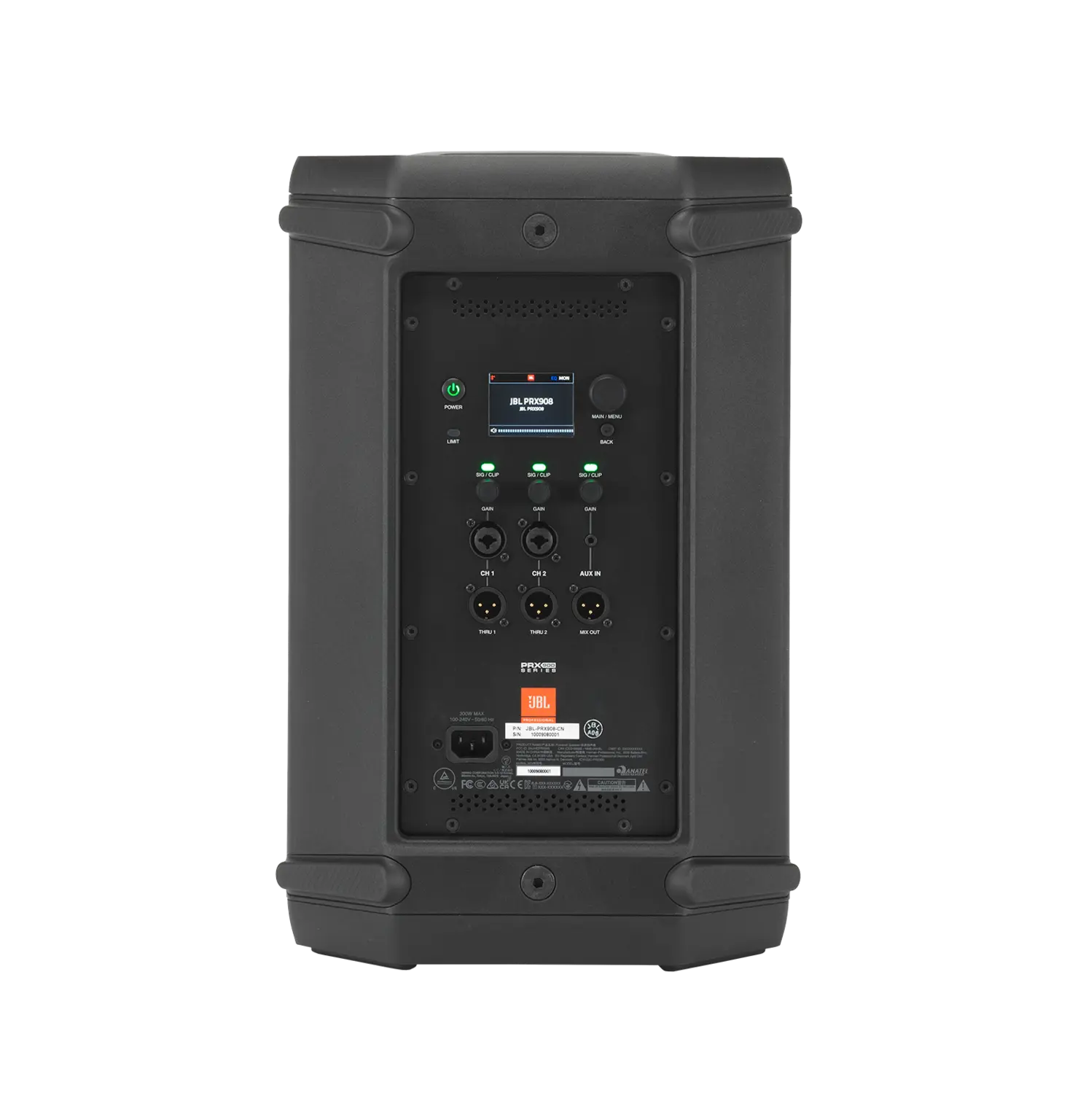 The PRX908 features onboard DSP accessible via a color LCD screen or the JBL Pro Connect app. The system includes 12-band parametric EQ, dbx DriveRack technology with Automatic Feedback Suppression, soft limiter, speaker delay, and optimized presets for pairing with subwoofers. Through the JBL Pro Connect app, users can control up to 10 speakers, access speaker snapshots, grouping, and integrate with JBL EON ONE MK2, PRX ONE, and EON700 systems.