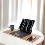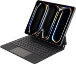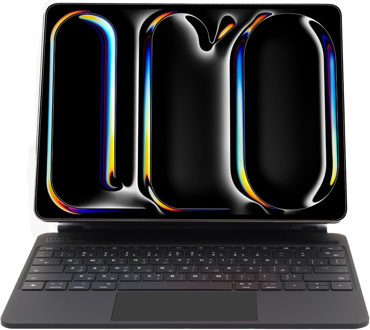 Levelo AeroBoard Wireless Keyboard in Black is precision-engineered for iPad Pro 13″ (2024), featuring a premium Saffiano leather finish with stainless steel shaft. It includes a multi-gesture trackpad, scissor feet keys, and ambient glow layout with 7 color modes. Bluetooth connectivity supports up to 10 meters with auto-pairing and LED indicators. The keyboard adjusts up to 130° for ergonomic use and is powered by a 500mAh battery offering up to 300 hours standby. Charges via Type-C in 3.5 hours. Designed for seamless navigation and professional-grade typing in low-light environments.