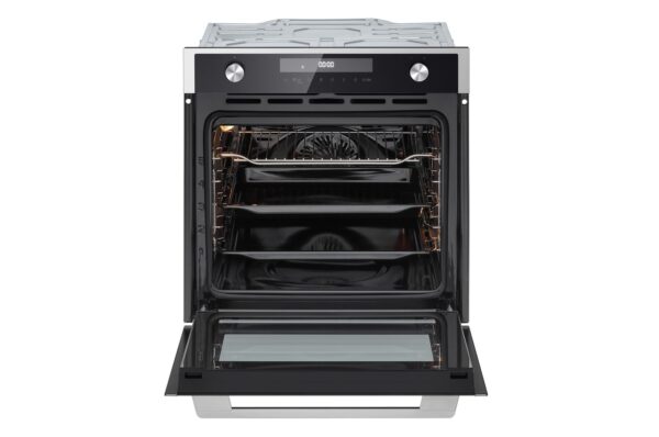 Spacious 72L LG built-in oven with multiple cooking modes, telescopic rails, removable door glass, and energy-efficient Class A rating for precise, convenient, and eco-friendly cooking.