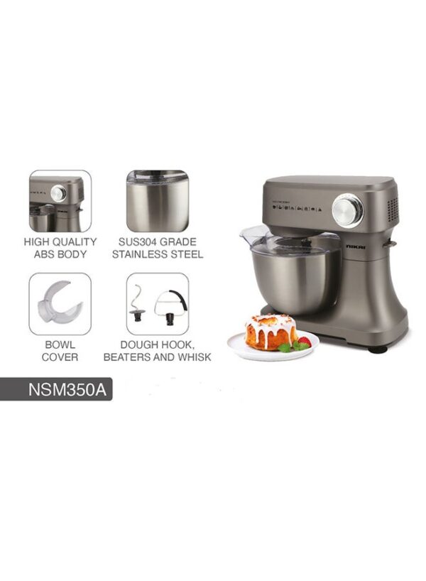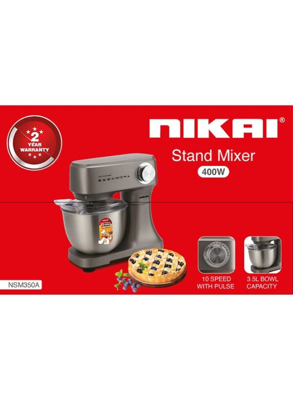 The Nikai NSM350A Stand Mixer features a durable 3.5L SUS304 stainless steel bowl, 400W motor, 10-speed control with pulse function, and 3 versatile attachments for effortless and precise mixing.