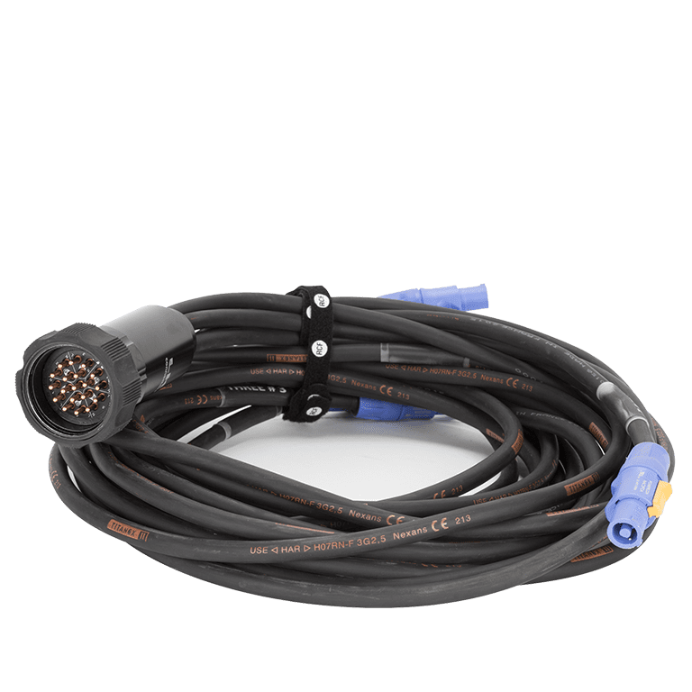 The RCF CBL LKS 19 SUB FANOUT is a durable power distribution cable featuring a secure LKS 19 multipin connector that splits into six staggered-length PowerCON connectors to efficiently power multiple subwoofers.