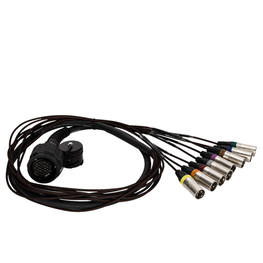 The CBLLKS252 FANOUT MultiPin Cable is a 2-meter professional audio breakout cable featuring a secure LK25 female connector that seamlessly splits into eight individual XLR male connectors for efficient signal routing.