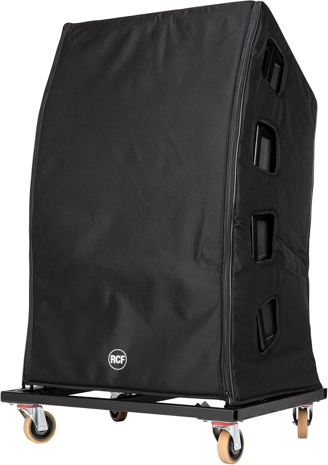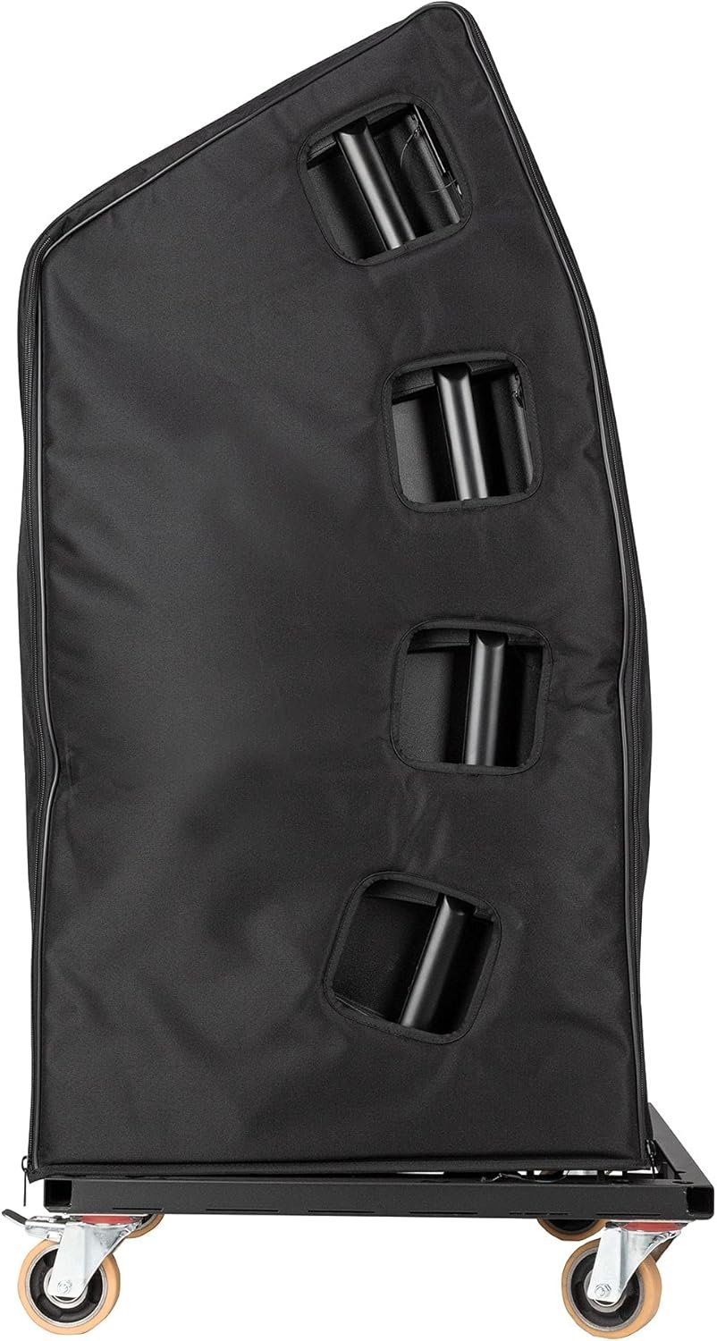 The RCF CVR 4X HDL 30 is a durable, heavy-duty padded nylon cover with secure zippers, custom-designed to protect four RCF HDL 30-A line array speakers while mounted on a transportation cart.