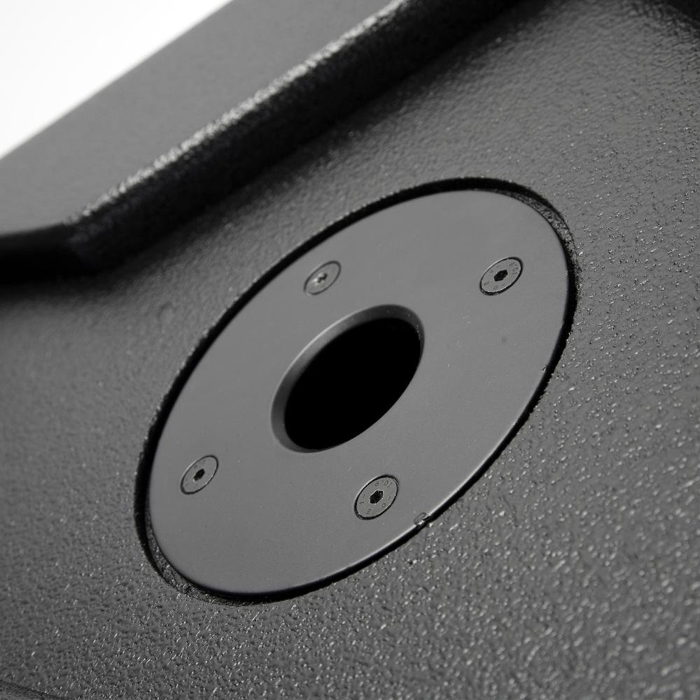 The cabinet is constructed from durable Baltic birch plywood with a rugged protective finish designed for long-term touring reliability. It includes an ergonomic side handle integrated with the input panel for easy handling and transport. A 35 mm pole mount allows flexible deployment as a portable PA system.