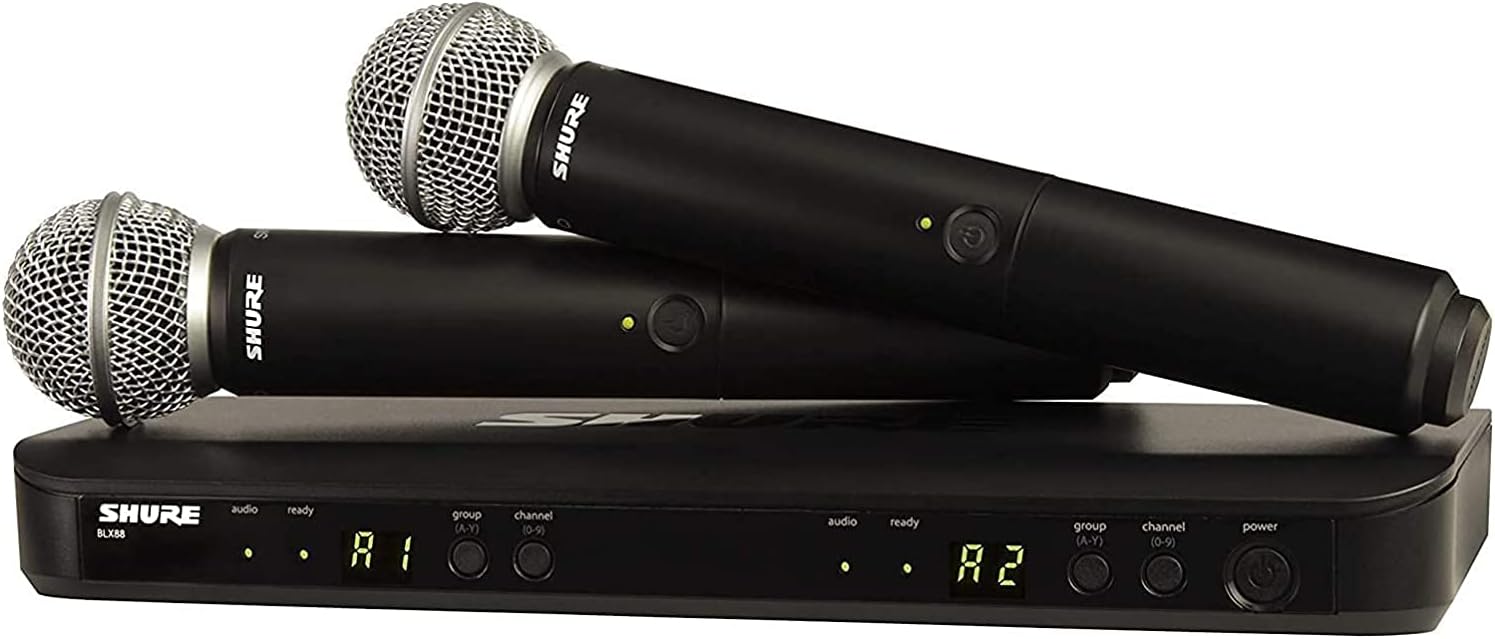- Dual-channel wireless system with BLX88 receiver and 2× BLX2/SM58 handheld transmitters