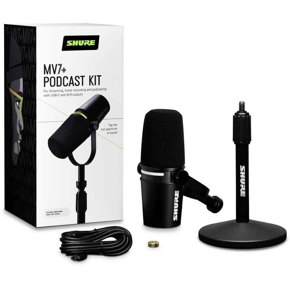 The Shure MV7+ K-Bundle XLR USB Speech Microphone in Black is a versatile microphone kit designed for podcasting, streaming, and professional vocal recording. It features both XLR and USB connectivity, allowing seamless use with computers or audio interfaces.