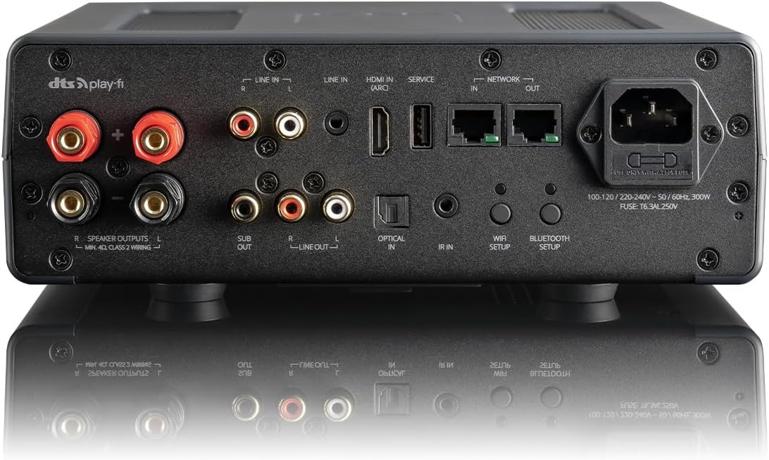 Versatile connectivity options include HDMI input with ARC for TV connection, line-level RCA, optical, 3.5mm AUX, Ethernet, and a subwoofer output for enhanced low-frequency performance. Control is simple through the front panel interface, IR remote, smartphone or desktop app, and voice commands via Alexa, Siri, or Hey Google. Six customizable front-panel presets allow instant access to playlists, streaming services, or favorite content, while multi-room DTS Play-Fi compatibility enables whole-home audio setups.