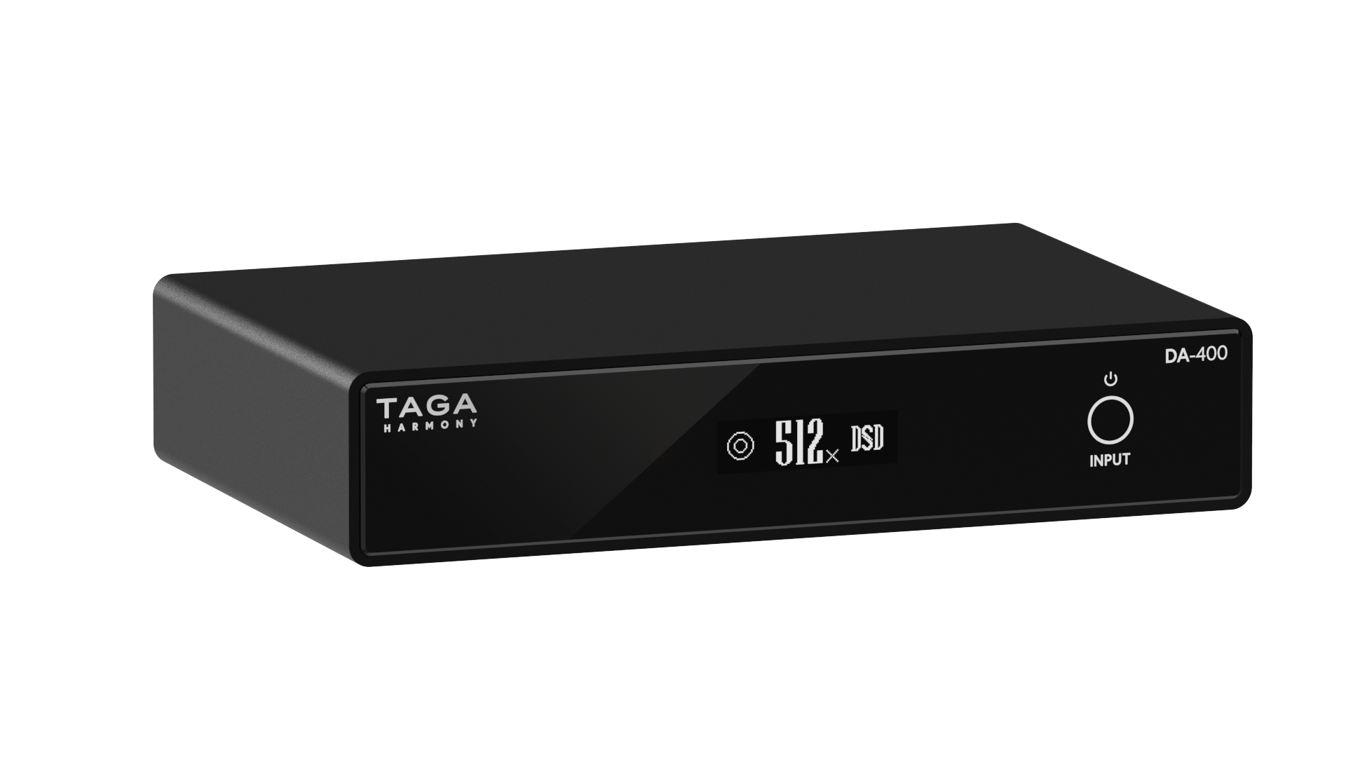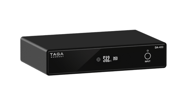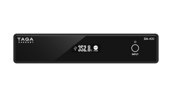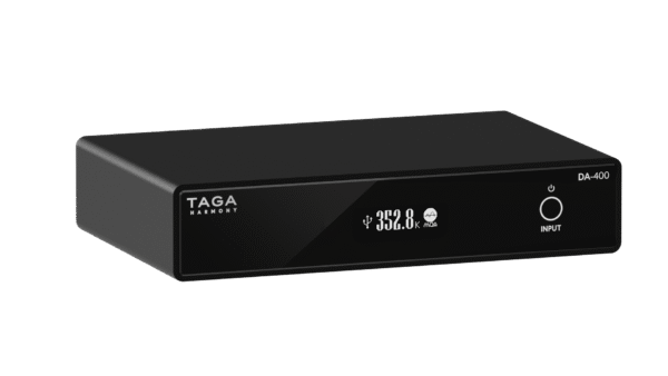 The TAGA DA-400 is a high-resolution DAC converter supporting PCM up to 32-bit/768kHz, DSD512, and MQA decoding. It features the ESS SABRE ES9038Q2M DAC and XMOS 16-core USB processor for jitter-free playback. Inputs include USB, optical, and coaxial; outputs include analog RCA and optical. OLED display shows signal status and format. Housed in aluminum with gold-plated connectors. Dimensions: 4.5 × 20 × 15 cm Weight: 1.1 kg. Finished in Black.