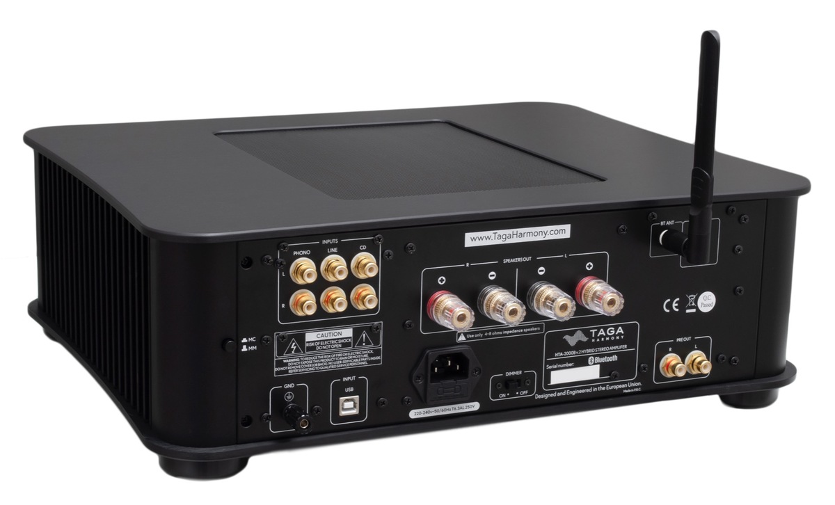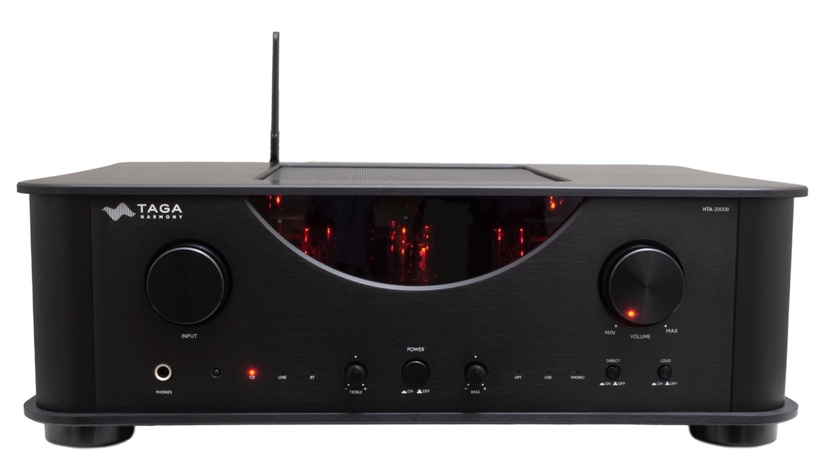 The TAGA Harmony HTA-2000B v.2 Hybrid Amplifier in Black is a premium 150W integrated stereo amplifier that blends the rich, analog warmth of vacuum tubes with the power and precision of solid-state transistors. Designed for audiophiles and music lovers, it features a 12AX7 tube preamp stage and a 12AU7 SRPP buffer circuit, delivering lifelike, dynamic sound with deep bass and crystal-clear highs. The built-in 32bit/384kHz USB DAC ensures high-resolution playback from computers and digital sources, while Bluetooth connectivity makes wireless streaming easy from smartphones and tablets. Gold-plated speaker terminals, ALPS volume potentiometer, and MKP capacitors guarantee pure signal flow and minimal distortion. With support for MM and MC turntables, headphone output, and preamp out for subwoofers or external amps, the HTA-2000B v.2 is a complete solution for high-fidelity home audio systems.