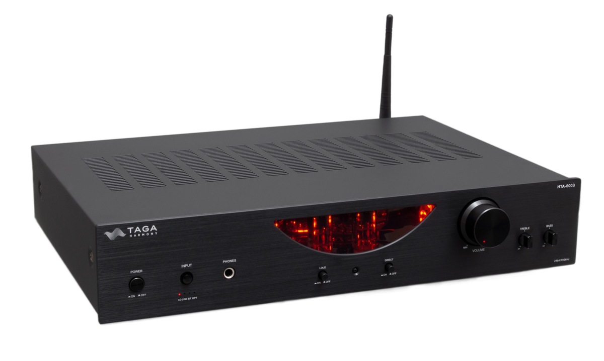 The TAGA HTA-600B Hybrid Amplifier is a 2×30W Class AB unit with dual 6H3 tubes and transistor output. It includes Bluetooth, optical input, MM phono support, and a 24-bit/192kHz DAC (Cirrus Logic CS4344). The 150W toroidal transformer and ALPS volume control ensure dynamic, low-noise playback. Outputs include headphone and preamp, with treble/bass and loudness controls. Gold-plated terminals and ceramic sockets enhance signal integrity. Finished in Black. Built for budget-friendly analog warmth and digital flexibility.