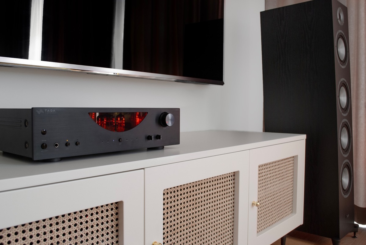 The TAGA Harmony HTA-800B Hybrid Amplifier in Black is a high-fidelity 2×50W stereo amplifier that blends the smooth, analog warmth of vacuum tubes with the dynamic power of solid-state transistors. Designed for music lovers and audiophiles, it features two 6H3N Russian vacuum tubes in the preamp stage and four Toshiba transistors in the output section, delivering lifelike sound with rich bass and clear highs. The built-in 24bit/192kHz DAC ensures high-resolution playback from digital sources via optical and coaxial inputs, while Bluetooth allows wireless streaming from smartphones, tablets, and laptops. With MM phono input for vinyl playback, headphone output for private listening, and preamp out for subwoofers or external amps, the HTA-800B is a complete solution for modern hi-fi setups. Finished in sleek black aluminum with gold-plated terminals and audiophile-grade components for pure signal flow and minimal distortion.