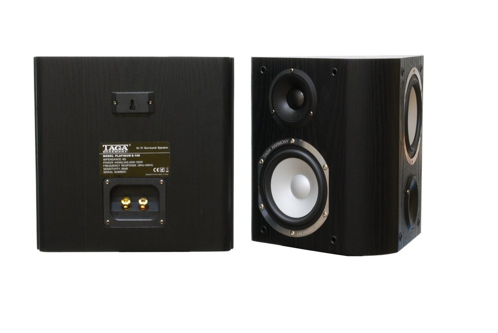 The TAGA PLATINUM S-100 v.4 Surround/Bipolar Speakers feature dual titanium tweeters and aluminum midrange drivers in a bipolar configuration. TLIE-II enclosure with 12mm MDF walls and advanced damping material reduces resonance. BOM ports and Ogrodnik crossover deliver wide dispersion and immersive surround effects. Magnetically mounted grilles and gold-plated terminals included. Finished in Black vinyl. Built for rear or side-channel deployment in theater systems.