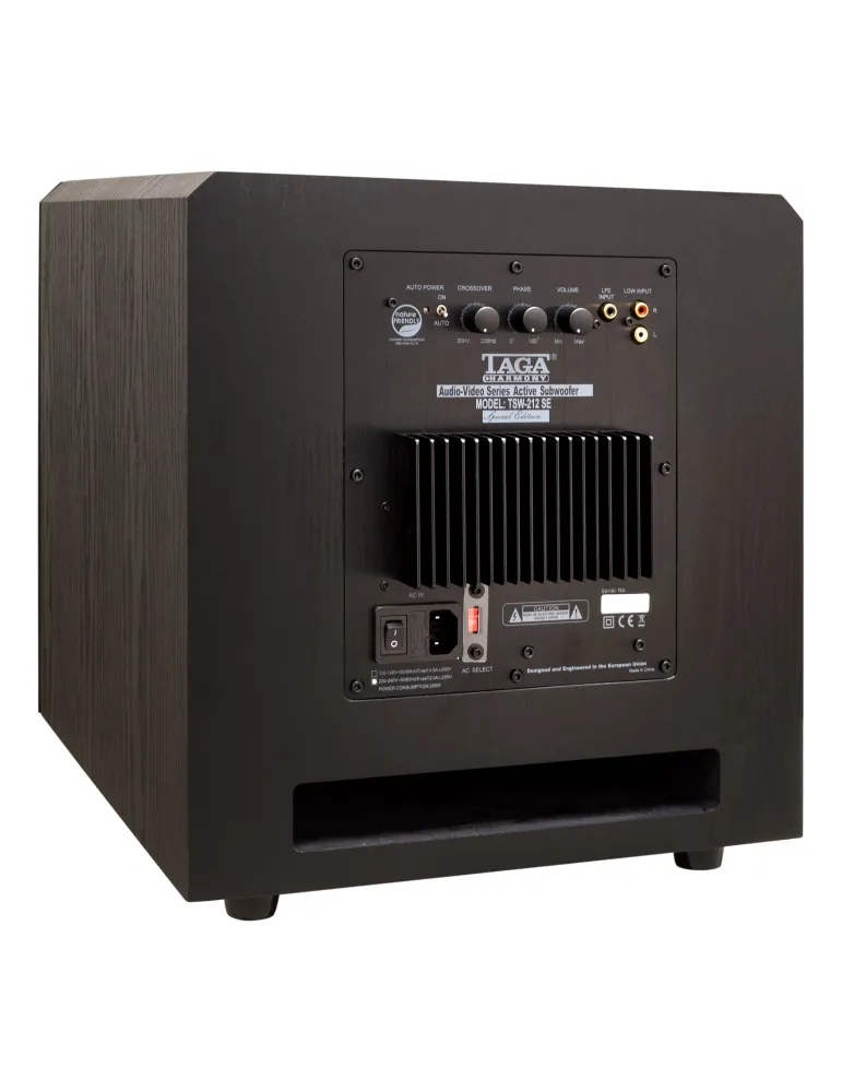 The TAGA Harmony TSW-212 SE Subwoofer in Oak, Walnut, or White finish is a Special Edition 12″ active subwoofer engineered for ultra-deep, high-precision bass in home theater and hi-fi systems. Powered by a built-in 240W RMS Class AB amplifier (750W dynamic peak), the SW-212 SE delivers high-current output, fast transient response, and low distortion. The SE version features upgraded internal components, a heavily modified polypropylene cone woofer, and a redesigned TLIE (Taga Low Interference Enclosure) cabinet with increased internal volume and stiffness. The 12″ bass driver is housed in a rigid TSAC metal chassis with oversized ferrite magnet and copper voice coil, enabling high amplitude movement and accurate signal tracking. A rear slotted bassreflex port enhances airflow and extends low-frequency output with minimal turbulence. With auto on/off, phase control, and IEC power inlet, the TSW-212 SE offers audiophile-grade performance and flexible integration—ideal for movie lovers, music enthusiasts, and bass-driven setups seeking reference-grade sub-bass clarity and punch.