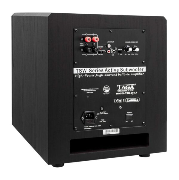The TAGA Harmony TSW-90 v.4 Subwoofer in Black or Wenge finish is a compact 10″ active subwoofer designed to deliver deep, clean bass with precision and control for home theater and stereo systems. This fourth-generation model features a redesigned high-current Class AB amplifier with 95W RMS output (260W peak), offering improved efficiency, faster transient response, and lower distortion. The 255mm paper cone woofer is housed in a TLIE (Taga Low Interference Enclosure) cabinet made from thick MDF panels, internally braced and acoustically damped to eliminate unwanted resonances and standing waves. A rear slotted bassreflex port enhances airflow and extends low-frequency output with minimal turbulence. The v.4 version includes upgraded capacitors, a modified woofer motor structure, and a detachable IEC power inlet for enhanced stability and audiophile cable compatibility. With auto on/off, phase control, and compact footprint, the TSW-90 v.4 delivers room-filling bass with clarity and punch—ideal for audiophiles, movie lovers, and space-conscious setups.