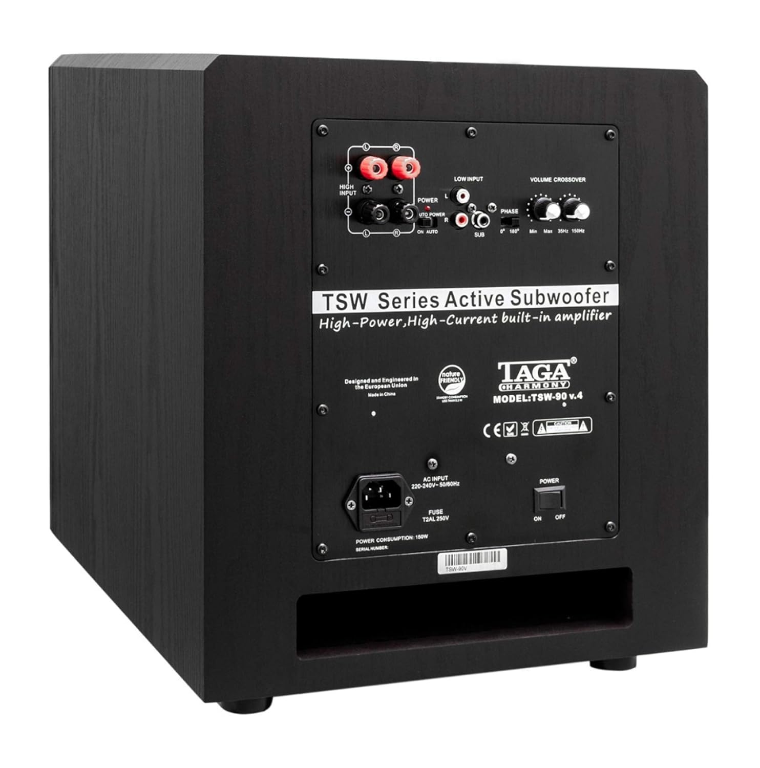 The TAGA TSW-90 v.4 Active Subwoofer in Black and Modern Wenge features a 10″ paper cone driver and 95W RMS Class A/B amplifier with 260W peak. TLIE cabinet with rear slotted port and upgraded woofer delivers deep, precise bass. Frequency response: 30Hz–150Hz Impedance: 6Ω. Includes auto on/off, phase control, and removable IEC power cord. Dimensions: 40 × 33 × 40.5 cm Weight: 15 kg. Built for dynamic performance in compact theater setups.