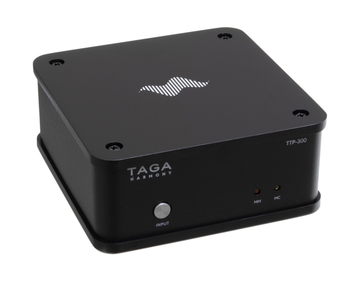 The TAGA TTP-300 is a MM/MC phono amplifier with front-panel cartridge selector and accurate RIAA equalization. It features low-noise ICs and ultra-low output impedance for clean analog signal. Inputs include RCA phono with ground screw; output is stereo RCA line-level. LED indicators show active cartridge mode. Compact steel-aluminum chassis provides shielding. Dimensions: 4 × 10 × 13 cm Weight: 0.6 kg. Finished in Black.