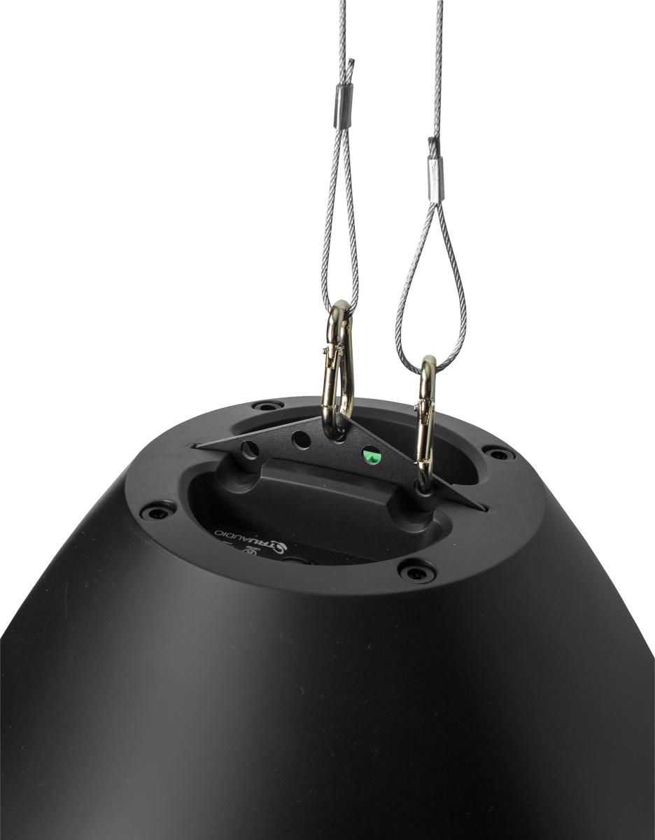 The TruAudio BD-8BK Pendant Speaker in Black is designed for commercial distributed audio systems. It provides high-quality sound, easy ceiling suspension, and a sleek black finish for aesthetic integration.