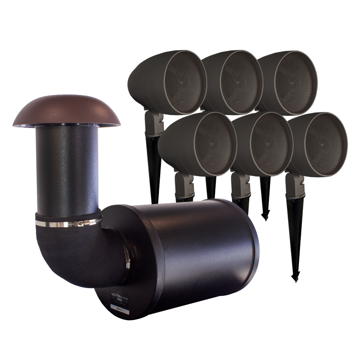 The TruAudio ULTRASCAPE-PRO+ is a premium outdoor sound system package, delivering enhanced performance and expanded coverage for high-end residential and commercial landscapes. With weatherproof components, it ensures superior durability and immersive outdoor sound quality.
