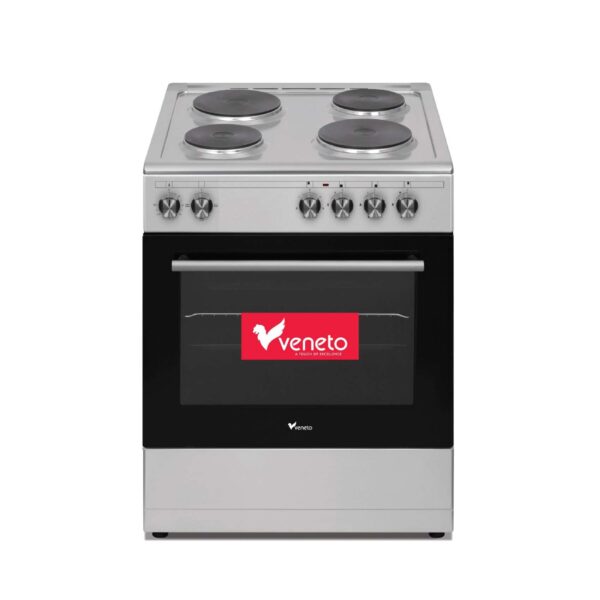 The Veneto VE66 4-Burner Gas Cooker in silver and black offers efficient cooking with a compact 60x60cm footprint, ideal for modern kitchens needing style and performance.