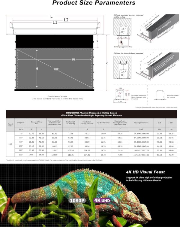 The VIVIDSTORM VPCLUST120HA 120-inch Phantom Ceiling UST ALR Projector Screen delivers an exceptional ultra-short throw (UST) cinematic experience with Ambient Light Rejection (ALR) technology. Designed for home theaters and professional installations, this recessed ceiling screen provides smooth motorized operation, a sleek aesthetic, and a durable casing. Its ALR surface enhances contrast and color accuracy even in bright environments. Compatible with a variety of UST projector types and resolutions, the VPCLUST120HA ensures effortless functionality with premium performance for immersive viewing.
