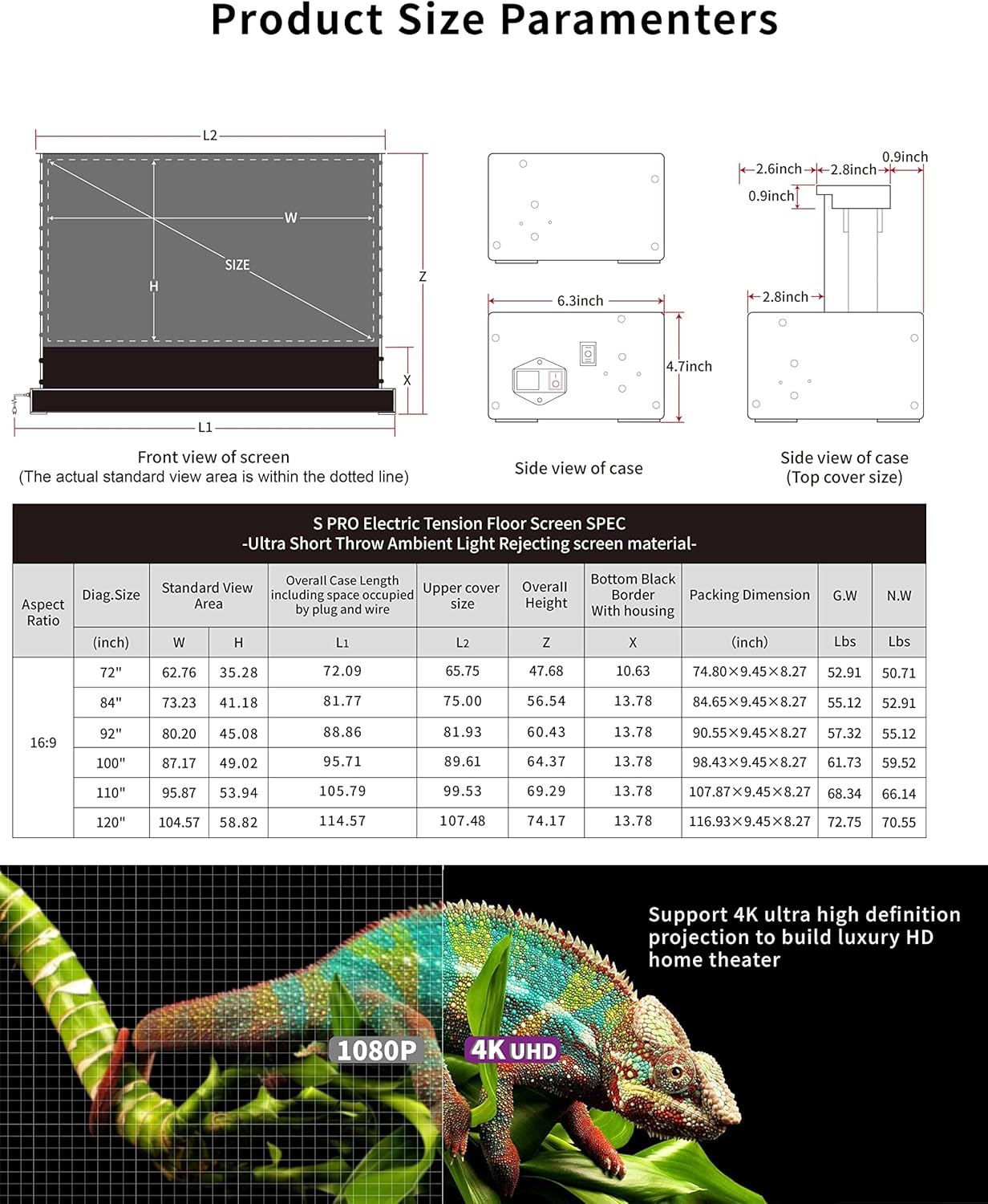 The VIVIDSTORM VWSDSTUST120H 120-inch ALR S PRO Floor Rising Projector Screen delivers an advanced cinematic experience with Ambient Light Rejection (ALR) technology. Designed for home theaters and professional setups, this motorized floor-rising screen provides smooth, quiet operation and a sleek, durable casing. Its ALR surface enhances contrast and color fidelity even in bright environments. Compatible with various projector types and resolutions, the VWSDSTUST120H combines effortless deployment and retraction with premium performance for immersive viewing.